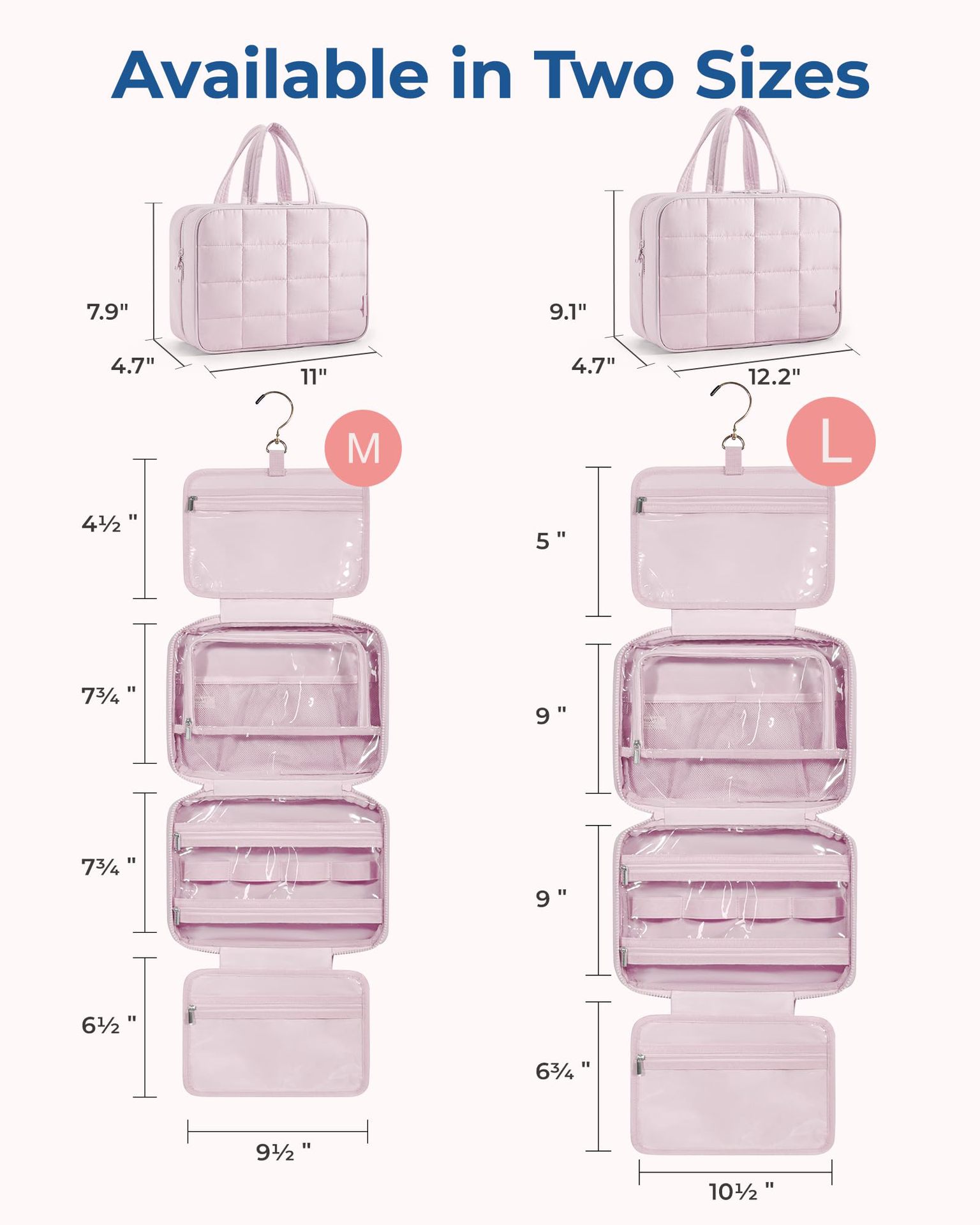 PLENTY OF STORAGE SPACE: Dimensions: Medium size - 11''L x 4.7''W x 7.9''H(closed). Large size - 12.2''L x 4.7''W x 9.1''H(closed). The travel toiletry bag can perfectly organize your necessary travel toiletries and makeup storage